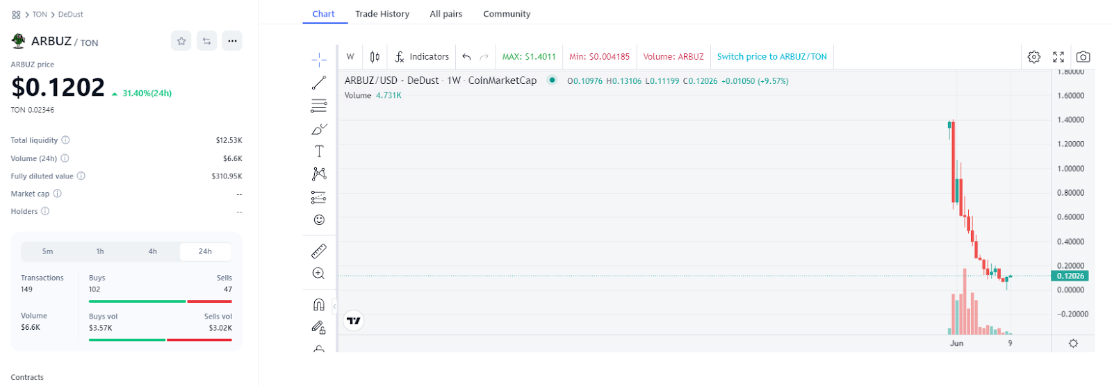 Листинг Click Arbuz bot уже состоялся, токен торгуется на децентрализованных биржах StonFi и Dedust. Стоимость монеты 12 центов.