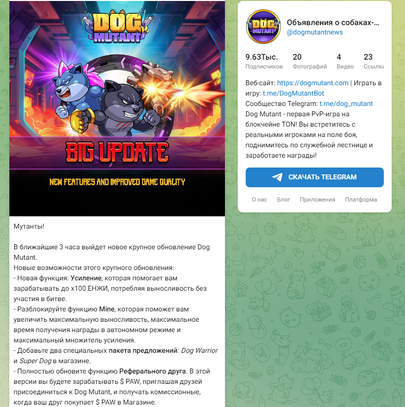 У Dog Mutant есть сразу несколько социальных сетей, но основным информационным источником выступает канал в Телеграмме под названием Dogmutantnews. Он был основан параллельно с релизом самой игры, но на момент написания данного обзора сумел набрать аудиторию из лишь практически 10 тысяч человек, что является довольно небольшим числом по сравнению со многими аналогичными проектами.