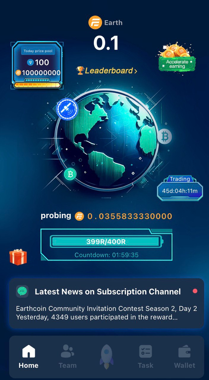 Далее задача игрока тапнуть на изображение планеты и спутник начнет автоматический майнинг Earth coin. За монету TON можно улучшить Earthcoin bot и сделать майнинг более прибыльным. Клейм монет возможен раз в несколько часов, а раз в 45 часов можно получить бонусы.