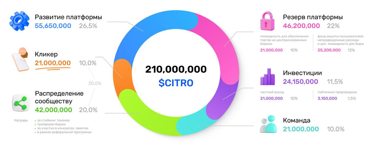 В основе игры лежит внутренний токена под названием CITRO. Именно его накапливают пользователи в ожидании листинга и дальнейшей продажи. Количество монет — 21 млн, а именно 10% от этого числа распределяются следующим образом:- 26.5% — развитие платформы;