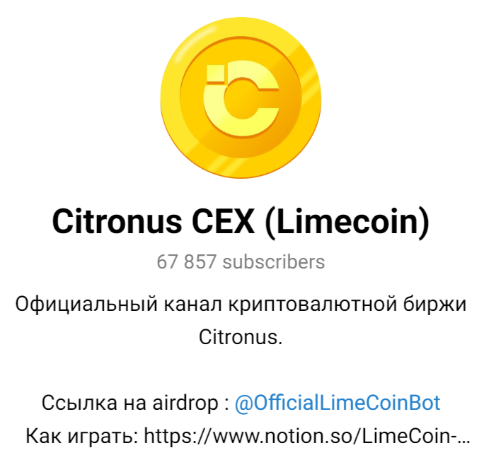 - Citronus CEX (Limecoin) — официальный канал биржи, который собрал аудиторию около 67 тыс. человек. Здесь публикации добавляются чаще, но периодичность размещения все равно небольшая. В среднем в течение недели появляется около 2-3 записей. Тематика — новости, которые касаются особенностей проекта и его развития.