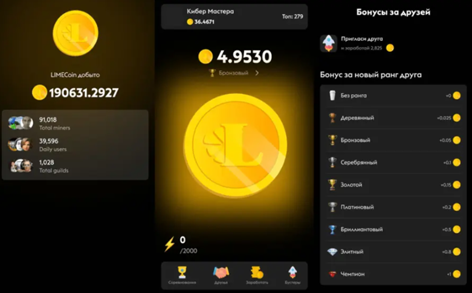 - майнинг — получение криптовалюты Limecoin с помощью кликов по экрану;