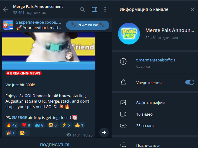У кликера Merge Pals есть свой официальный телеграмм-аккаунт — Merge Pals Announcement. Перейти в него можно по ссылке Mergepalsofficial. Аудитория у канала достаточно большая.