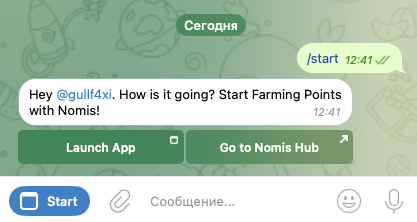 Прежде чем приступить к игре, нужно зайти Nomis App Bot и активировать его. После этого в чате отобразится короткое приветственное сообщение. Под ним будет располагаться кнопка Launch App – для открытия мини-приложения по ней следует нажать.