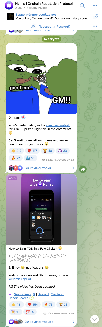 Основной источник информации о проекте – это телеграмм-канал Nomis Onchain Reputation Protocol. На него, на 19 августа 2024-го года, подписано свыше 2,67 миллионов пользователей.Однако если посмотреть активность аудитории на канале Nomis Protocol, то окажется, что она является очень низкой. Так, большинство публикаций не получают даже 100 тысяч показов. А это может говорить о том, что очень много людей подписано на канал сразу с нескольких своих аккаунтов.