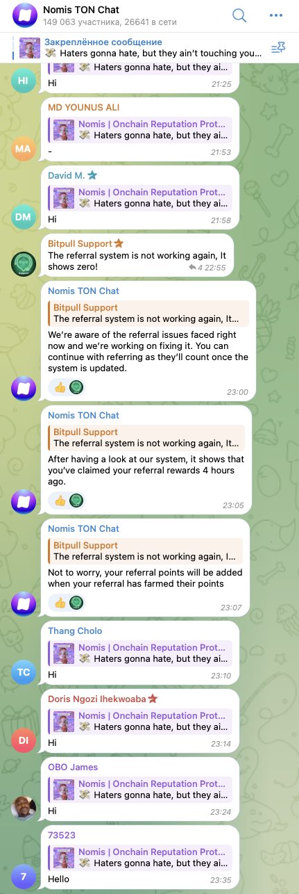Также в рамках проекта есть телеграмм-чат – Nomis TON Chat, Nomis Chat. В нем, в свою очередь, состоит около 150 тысяч участников. Активность же аудитории – средне-низкая. При этом, большинство сообщений в ленте данного аккаунта – это бессмысленные приветствия.