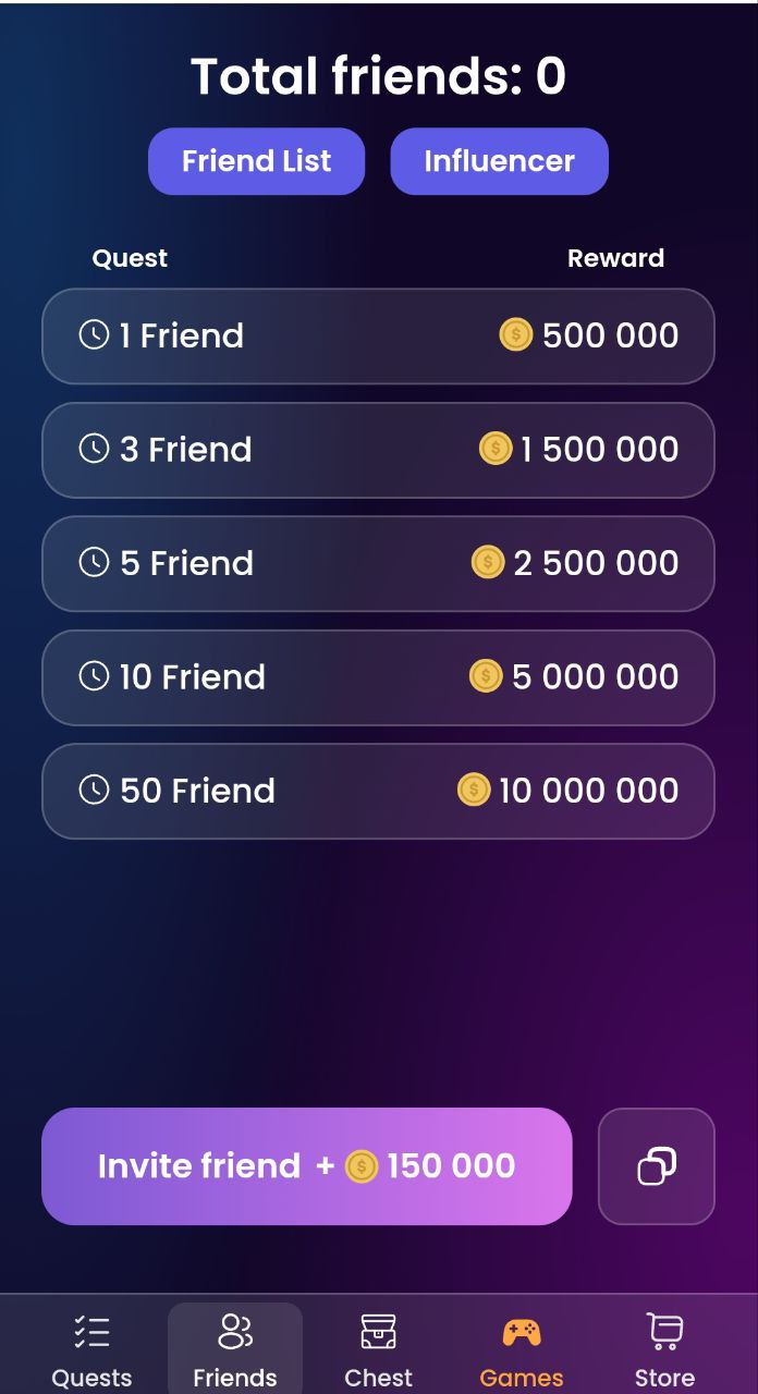 - Friends. При создании тактики Zargates Retrodrop важно включить возможности реферальной программы. Многие пользователи играют и параллельно привлекают новые аккаунты. За одного друга можно получить 500 000 токенов, за 3-х — 1.5 млн, за 5-х — 2.5 млн, за 10-х — 5 млн, за 50 — 10 млн.