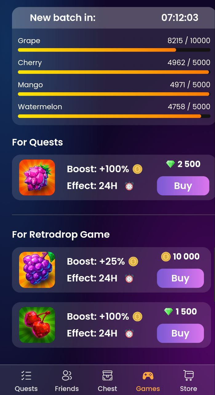 - Store. В этом разделе описывается два пункта — бустеры и airdrop Zargates Retrodrop. В первом случае пользователям предлагается купить разные boost для ускорения получения токенов в Заргейтс Ретродроп. Цена — от 2500 монет и выше. В разделе аирдропа указываются планируемые сезоны и размеры вознаграждения.