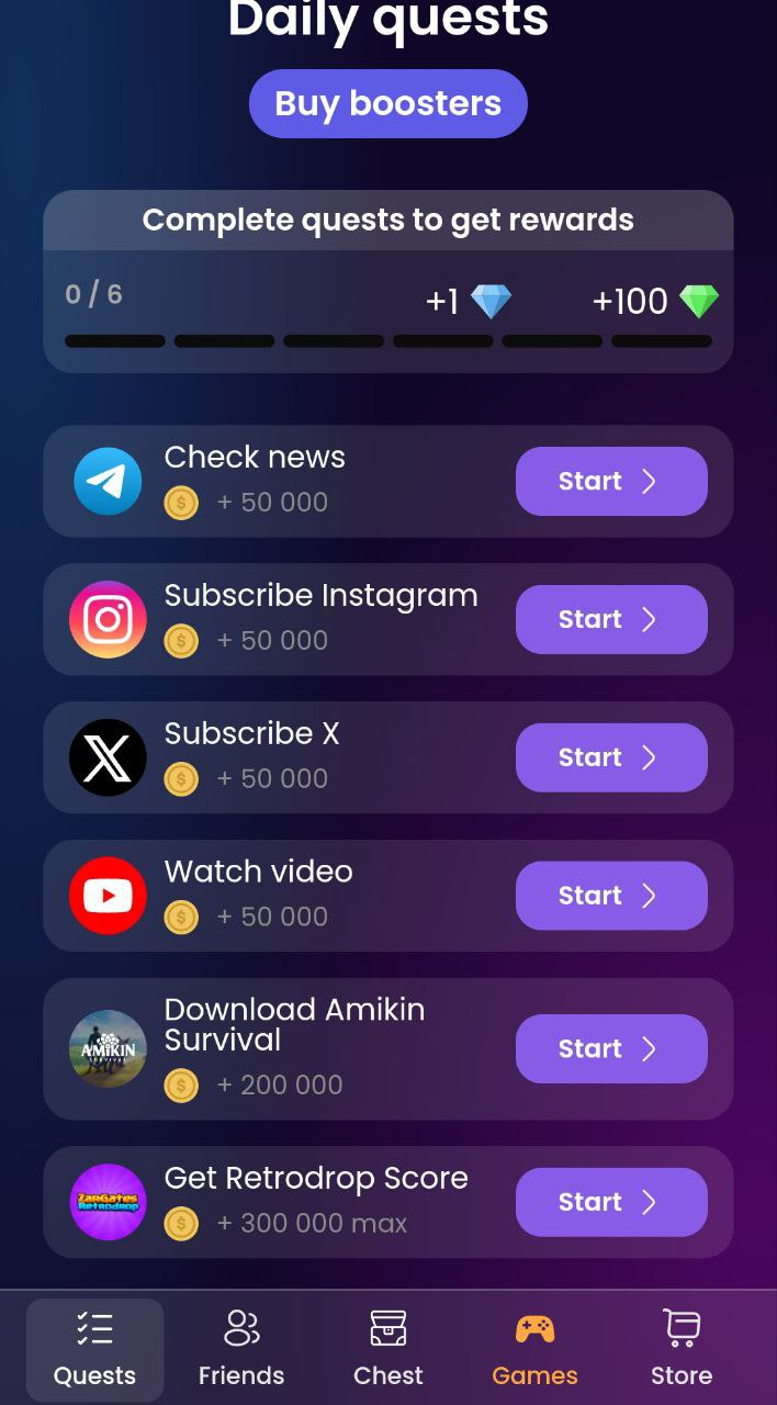 - Quest — задания Зар Гейтс. Их предлагается проходить для получения дополнительного заработка. К примеру, за подписку в Инстаграм дается 50 000 монет, за просмотр видео в Ютубе — 50 000, за загрузку Amikin Survival — 200 000 и т. д.