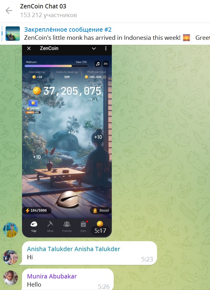 - игроки зарабатывают монеты Zen Coin через кликер и участвуют в airdrop, а это значит, что игра работает по стандартной модели кликера, где основной процесс — это клики и реферальная активность;