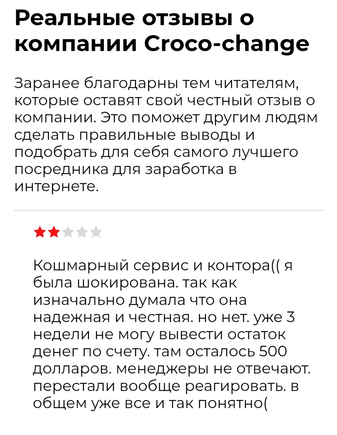 - Разногласие в отзывах и упоминания о проблемах с выводом денег создают не лучшую репутацию для Croco Change, следовательно, обмен активов осуществляется там на свой страх и риск.