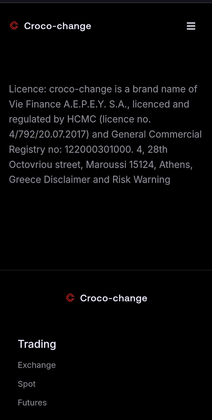 Платформа предлагает около 100 торговых пар, включая BTC/USDT и SOL/USDT, с возможностью бессрочных свопов. Присутствует функция листинга собственных токенов и фьючерсная торговля. Анализ юридической информации Croco Change выявил проблему: компания ссылается на лицензию греческой Vie Finance A.E.P.E.Y. S.A., хотя ее дочерние бренды фигурируют в скандалах.