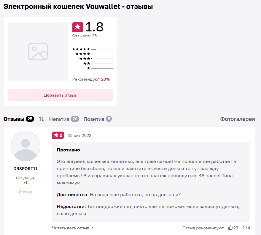 А на сторонних сайтах, как Отзовик, ситуация обратная. Здесь большинство отзывов о Воу Валет именно негативные. Всего здесь опубликовано 25 оценок с в среднем 1.8 баллами из 5. В отрицательных оценках люди пишут о тех же долгих задержках и получении денег только через скандал. Но в положительных отзывах пишут о высокой скорости и пополнения, и вывода. Однако главный фактор в том, что их гораздо меньше.
