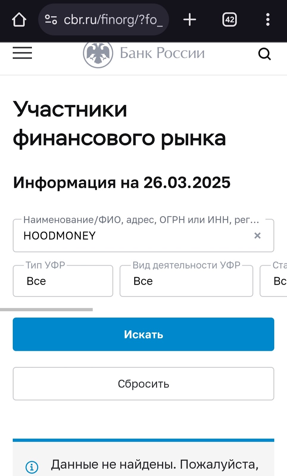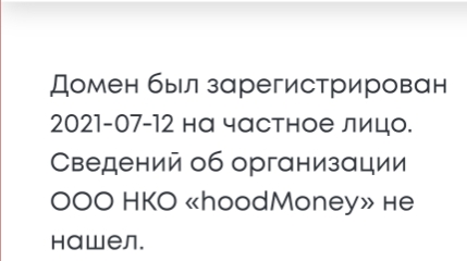 Официальной регистрации проект не имеет, а на сайте указано лишь несуществующее юридическое лицо — «ООО НКО Hood Money». Сам домен и вовсе оформлен на частное лицо.