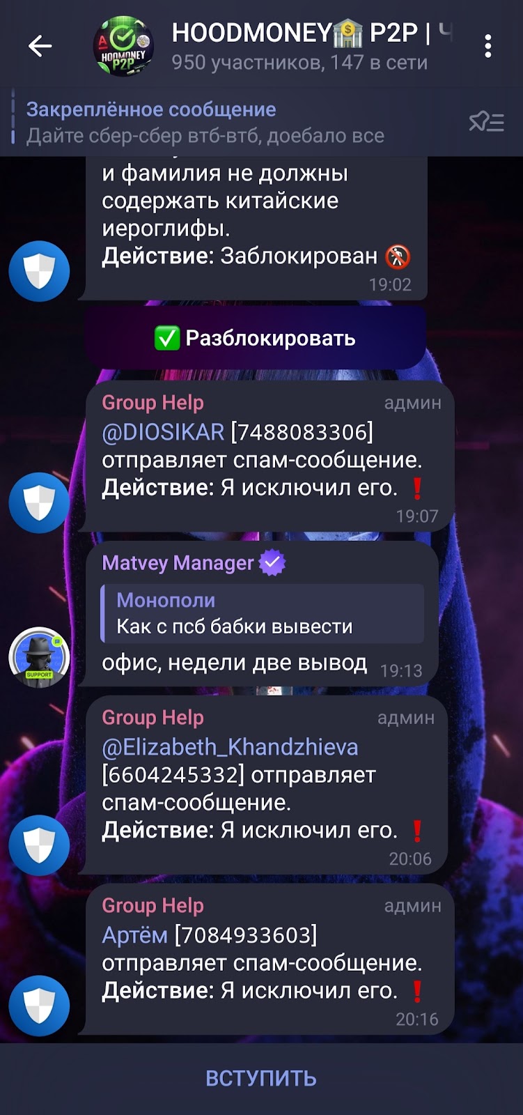 Уже это вызывает серьезное недоверие к сервису, так как он занимается деятельностью, права на которую не имеет. На многих сайтах для проверки «ХудМани» обозначен как мошенник.Отдельно стоит упомянуть инструкции, которые менеджер MoneyMaker выкладывает на каналах HoodMoney. На HoodMoneyP2P chat рассказывают, как обходить лимиты банков, снимать наличные без комиссий и избегать блокировок. Эти схемы могут сработать против пользователя — банки заметят подозрительные операции и заблокируют счета. Ещё один риск — требование передавать логины и пароли от банковских приложений для «настройки сервиса». Если это сделать, то сторонние лица получат полный доступ к вашим деньгам.