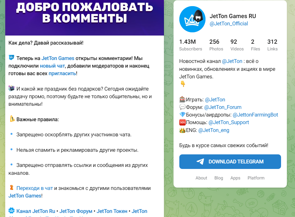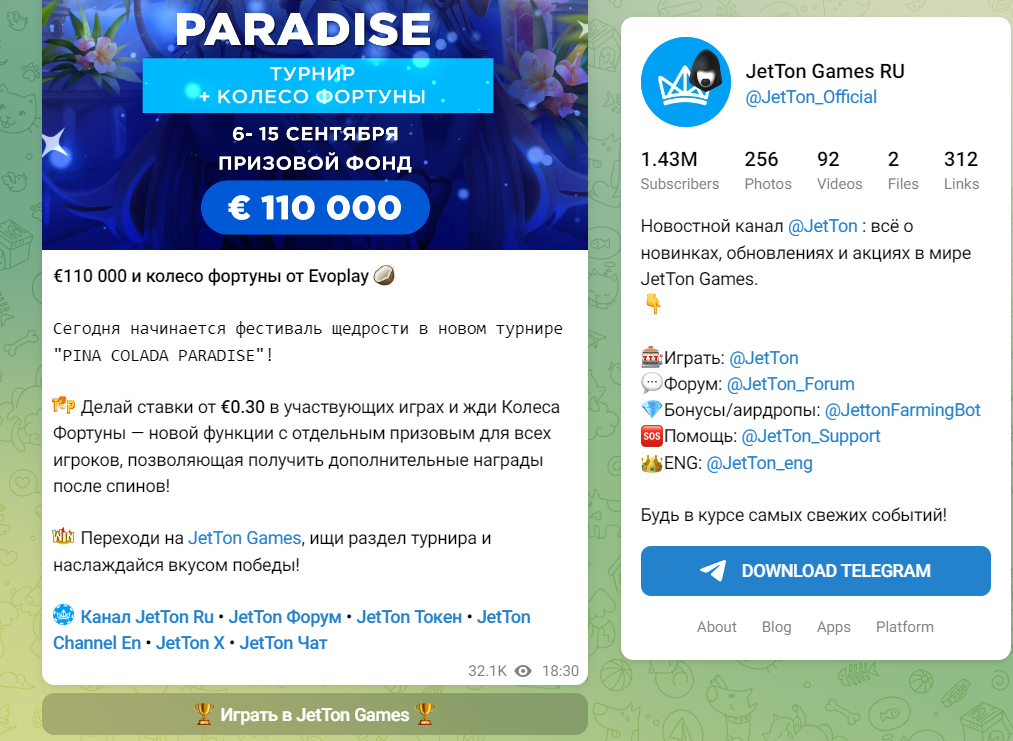 У проекта есть Телеграмм канал, чат, саппорт и отдельный бот для получения дропов. В Телеграмм Jetton почти полтора миллиона подписчиков, на чат подписано около 40 000 человек. Связь с менеджером по поводу партнерской программы — Jetton partners. По поводу багов и проблем обращаться нужно в Телеграм Jetton саппорт. В канале регулярно публикуют информацию о подключении новых игр на платформу. Также есть посты с историями клиентов казино, которые смогли сорвать банк.