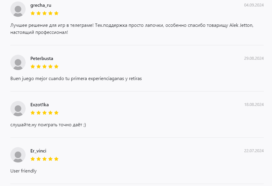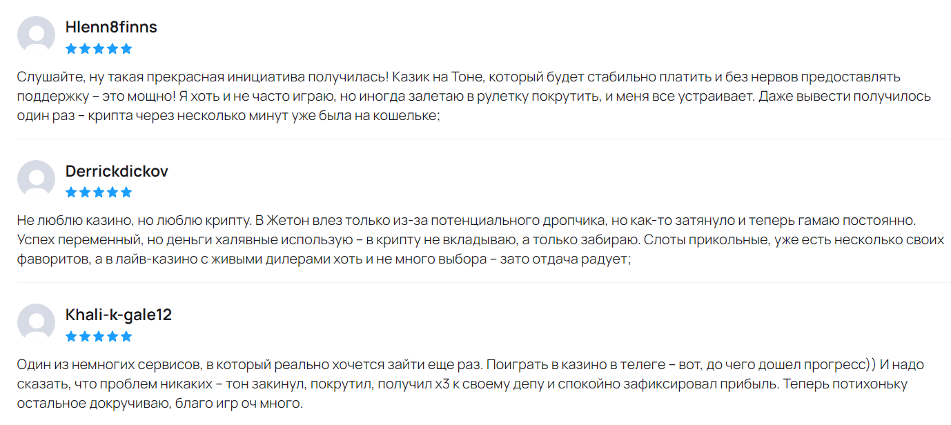 В сети о Jetton Games в Телеграмме отзывы положительные, так как игроки видят большие перспективы у онлайн казино. В первую очередь потому, что его можно пополнить криптой и остаться совершенно анонимным. Второе преимущество — играть можно прямо в Телеграмм, не скачивая приложение, то есть не забивая память смартфона. Третий плюс — большое количество провайдеров, разнообразие игр. Так как пользователей у Jetton Games на русском языке довольно много, то можно не сомневаться, что всегда найдутся игроки, то есть не нужно будет ожидать заполнение стола.