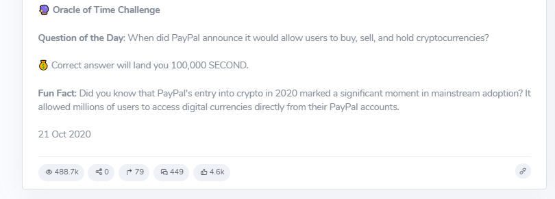 24 сентября в канале опубликовали новость, что в приложении Time Farm можно поучаствовать в Оракуле, то есть квизе. Вопрос касался PayPal, за правильный ответ можно было получить 100 000 токенов Second.