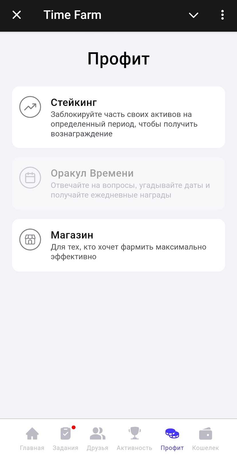 Раздел Профит содержит три вкладки. В Оракуле Времени проходят квизы, их объявляют в канале, за них можно заработать не только игровые монеты, но и реальные деньги. Анонсы квизов нужно отслеживать в Телеграм канале Time Farm.