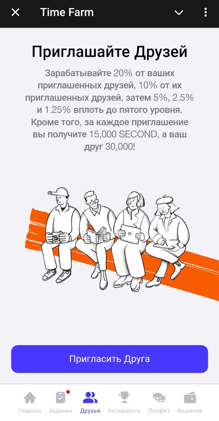 Реферальная программа в Телеграм Тайм Фарм очень щедрая. За каждого приведенного друга можно получить 15 000 поинтов единовременно. Также игроку будут начислять проценты от майнинга по пяти уровням: 20, 10, 5, 2,5 и 1,25% соответственно.