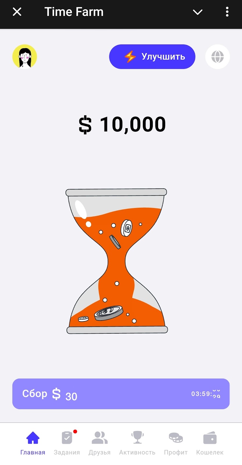 Фарм запускается на главном экране приложения. Каждые 4 часа пользователь получает 14 400 токенов Time Farm, затем майнинг нужно перезапустить заново.