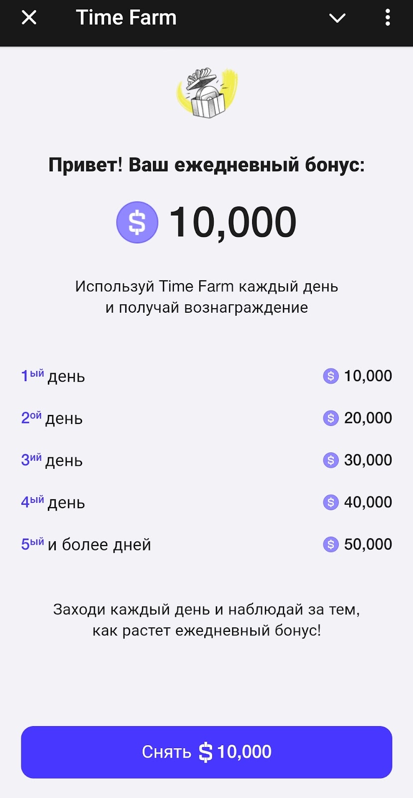 При регистрации в игре Time Farm пользователь получает краткую инструкцию по приложению. За вход в игру без пропусков дней будут начислены бонусы: