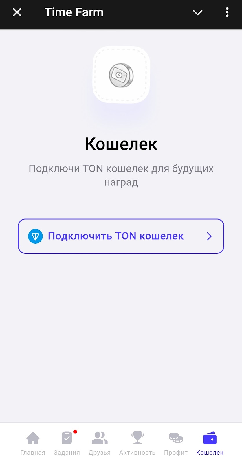В последнем разделе приложения находится кошелек. Здесь пока можно только подключить Тон адрес, на который планируется вывод токена. Стоимость Time Farm крипты пока не определена, снять ее нельзя. Фактически кошелек сейчас используется исключительно для доната.