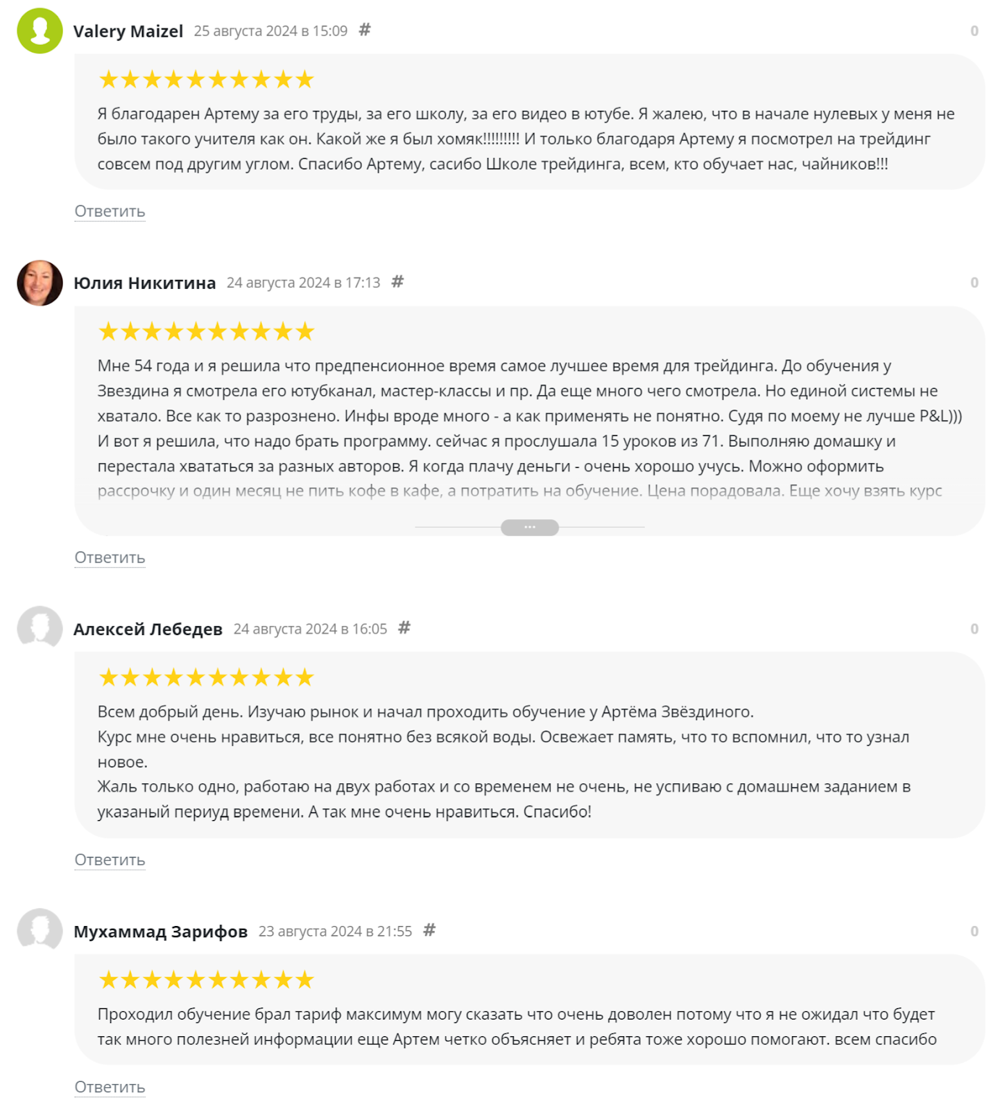 В интернете доступно множество отзывов о курсах Артема Звездина. Среди них встречаются и положительные мнения, в которых клиенты отмечают качественные ролики в Ютубе, профессиональное обучение, хорошие результаты в трейдинге после получения знаний. Многие просто в восторге и рекомендуют трейдера знакомым.