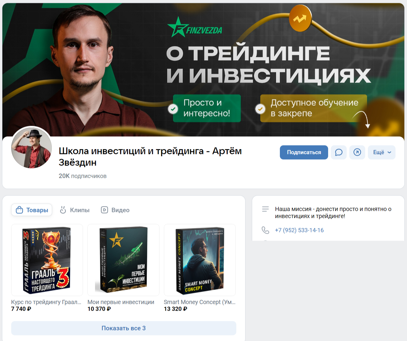 • ВК — vk com/public119164104. Группа называется Школа инвестиций и трейдинга — Артём Звёздин. На конец августа 2024-го на нее подписано около 20 тыс. человек. Здесь можно найти ссылку на сайт Умный инвестор и даже номер телефона для связи — +7-952-533-14-16. Для поддержания интереса трейдер регулярно добавляет новые публикации.