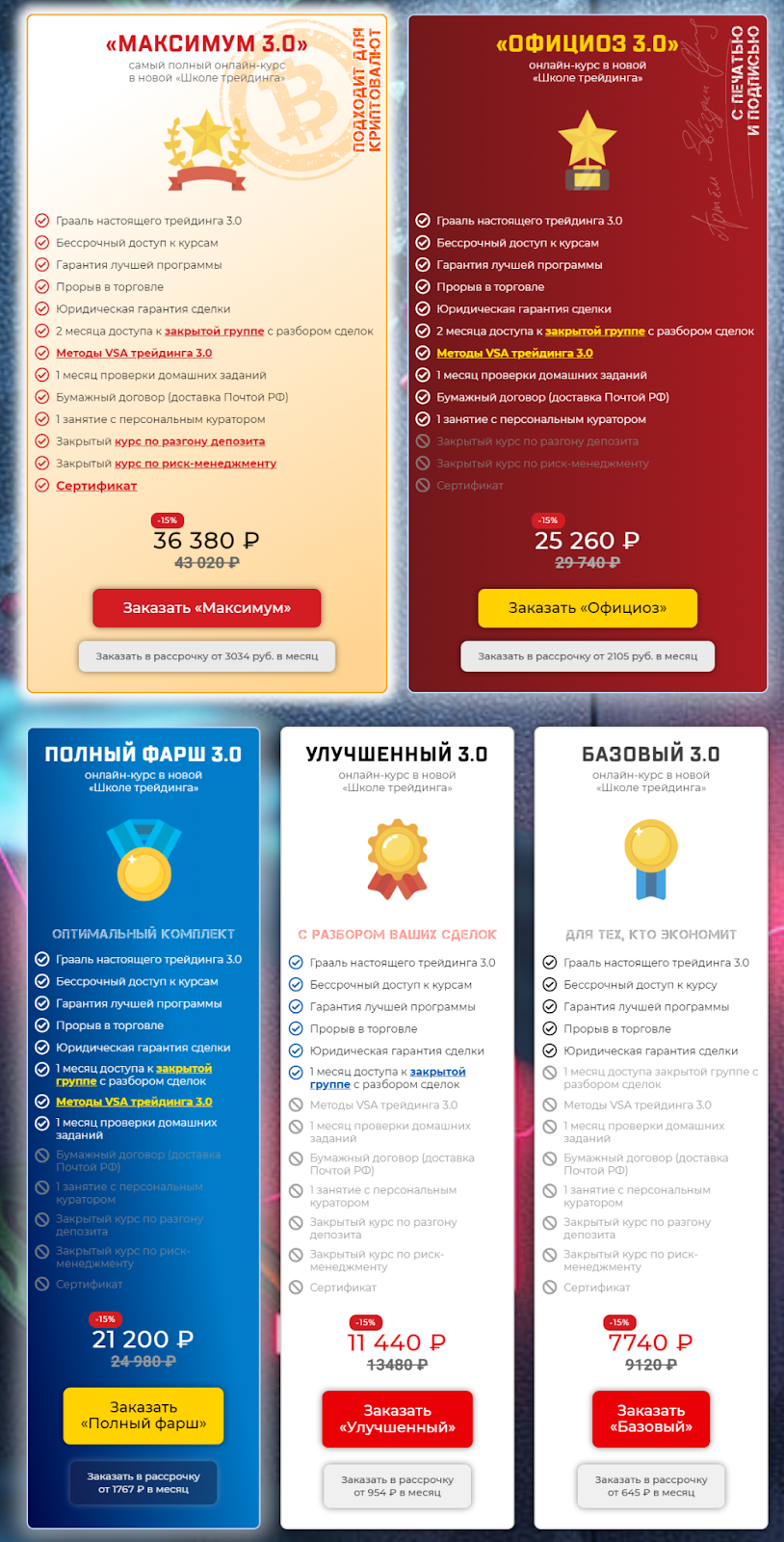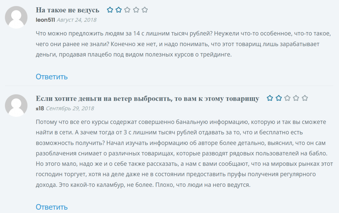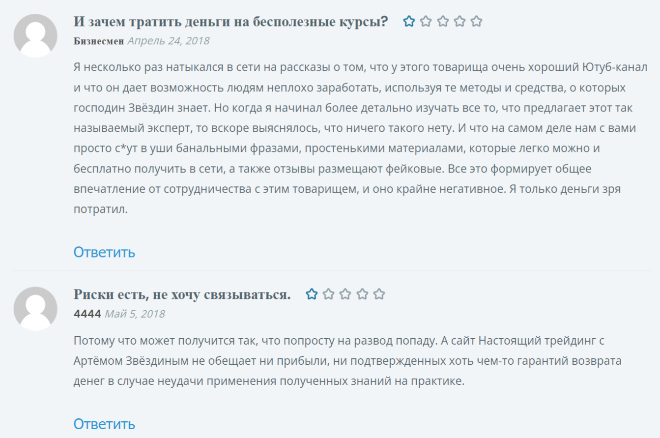 Параллельно встречаются и негативные отзывы о курсах трейдинга Артема Звездина. В них клиенты отмечают, что мошенник предоставляет банальную по своей сути информацию, которая доступна в интернете. В результате обучения не получится получить реальную прибыль, а зря потраченные деньги никто не возвращает. Жалобы касаются и высокой стоимости услуг, которая ничем не оправдана.