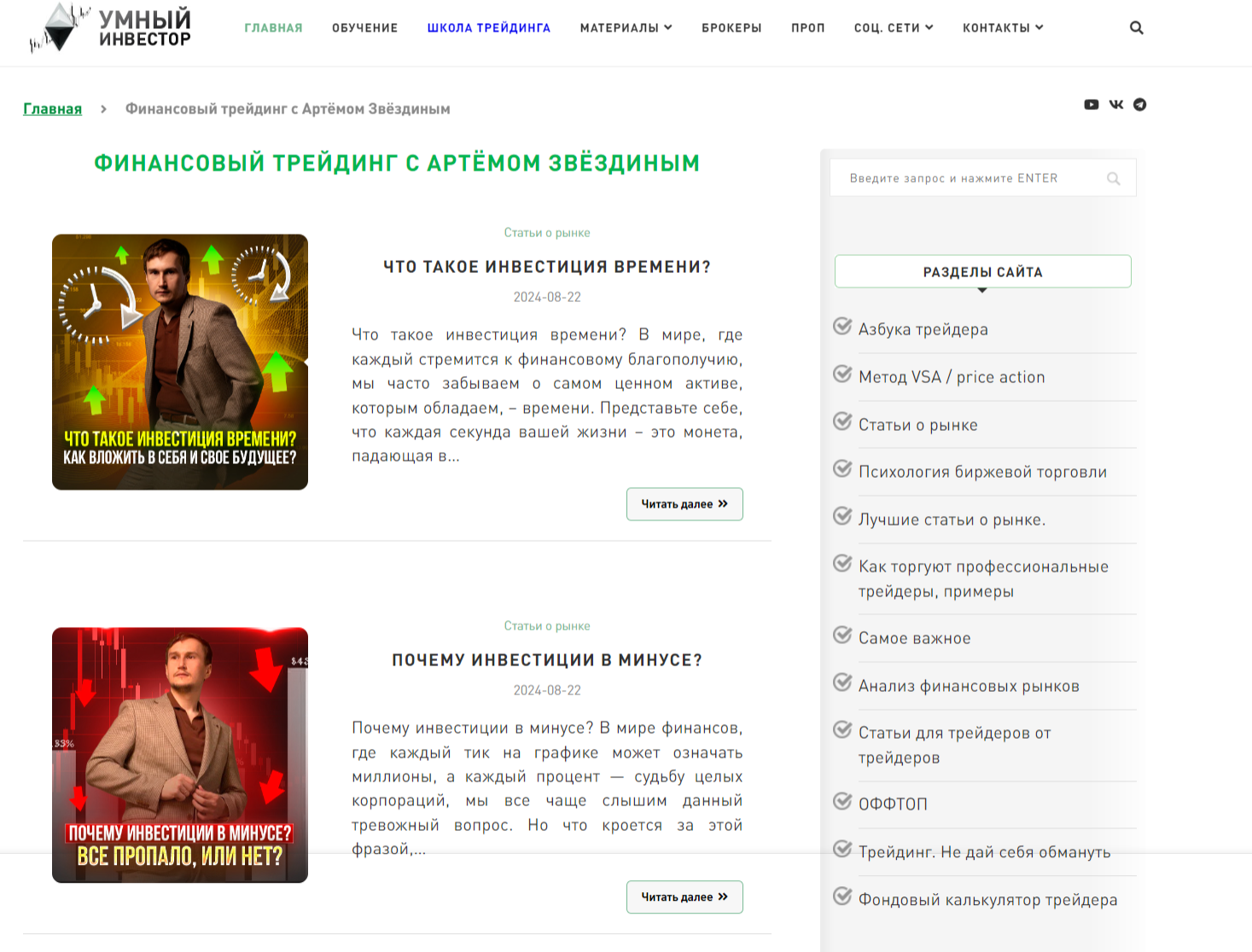На проекте Умный инвестор по ссылке умный-инвестор.рф Артем Звездин размещает статьи о рынке, дает подробный анализ рыночной ситуации, приводит секреты по трейдингу и т. д. Также пользователям доступен большой выбор полезных инструментов, к примеру, фондовый калькулятор трейдера для расчета потенциальной прибыли. В качестве партнеров приводятся такие гиганты как Финам, Московская биржа, ОКХ и другие.
