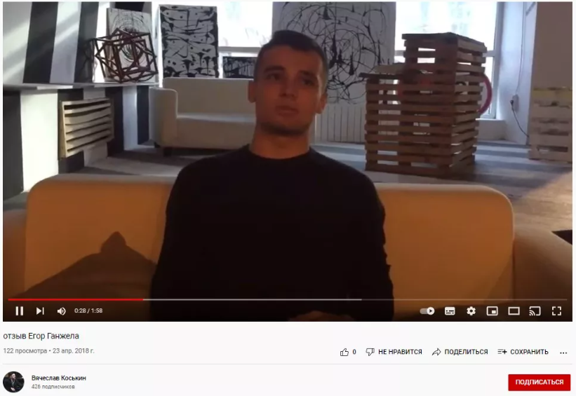 Еще на Юутубе можно найти видео-отзыв Егора Ганжелы на курсы психолога Вачеслава Коськина. Это еще раз говорит нам, что перед нами не настоящий трейдер, а обычный инфоцыган, который пытается заработать на инвесторах-новичках.