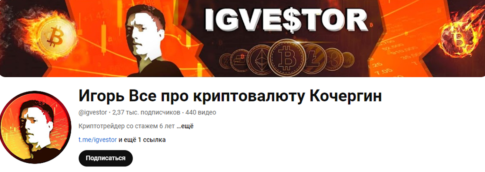 На Ютуб “Игорь Все про криптовалюту Кочергин” подписано чуть больше 2 300 человек. На канале мужчина рассказывает об основах торговли криптовалютой и раскрывает базовые инвестиционные понятия. Польза для новичков, несомненно, в контенте имеется, но некоторые торговые стратегии вызывают закономерные сомнения у более опытных подписчиков. Но просмотров у видео на “Игорь Кочергин Все про криптовалюту” немного, поэтому не исключена вероятность накрутки.