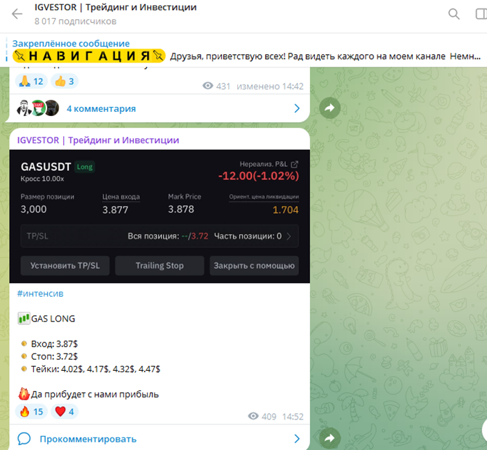 Чтобы убедить подписчиков в своей компетентности Игорь регулярно выкладывает посты с сигналами для входа в сделку и выхода из нее. В основном совершается покупка и продажа малоизвестных монет, поэтому риск подобных инвестиций крайне высок.