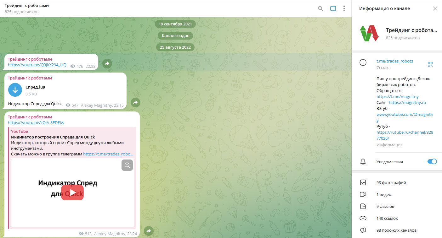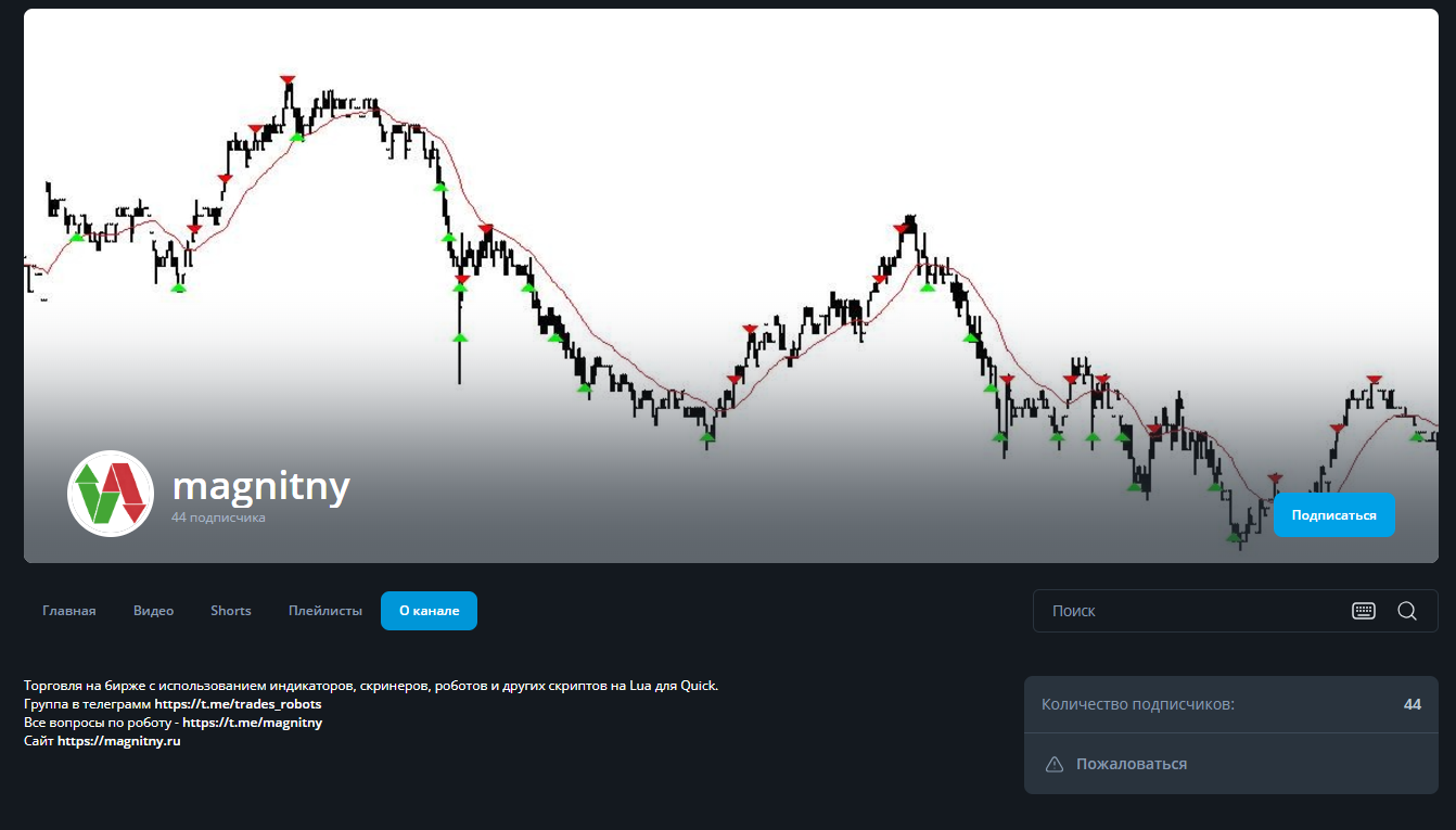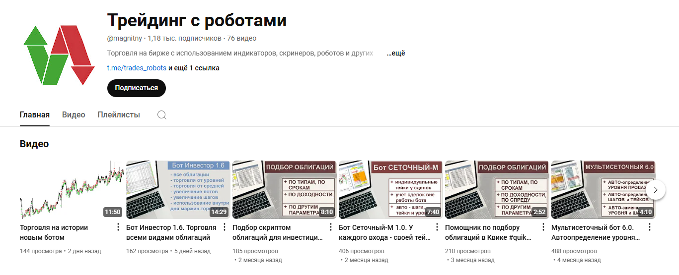 Работает по ссылке @magnitny с 2022 года. Имеет 1,1 тысячи подписчиков и 76 видео, которые набрали чуть более 60 тысяч просмотров. На канале автор рассказывает про торговлю на бирже с использованием индикаторов, скринеров, роботов и других скриптов на Lua для Quick.По факту все ролики на канале посвящены роботам автора — «Создаем биржевый Magnitny бот», «Торговля на Динамичном боте», «Железобетонный арбитраж с помощью арбитражного робота» и т.д.