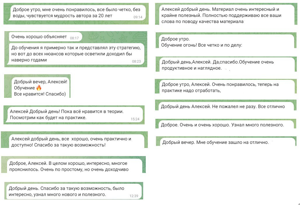 На канале Трейдинг c роботами авто публикует хорошие отзывы о своем обучении роботах. Но проблема в том, что по факту это не отзывы, а просто скрины коротких переписок. Реальны они или нет — не проверить.