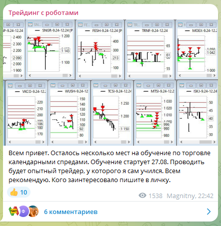 Разумеется на своих роботах! Но не только — в довесок к роботам он продает обучение по работе с ними. Например, обучение по торговле календарными спредами. Некоторые курсы проводит трейдер, у которого автор канала сам учился. Возможно, он продвигает курсы своего учителя за процент.