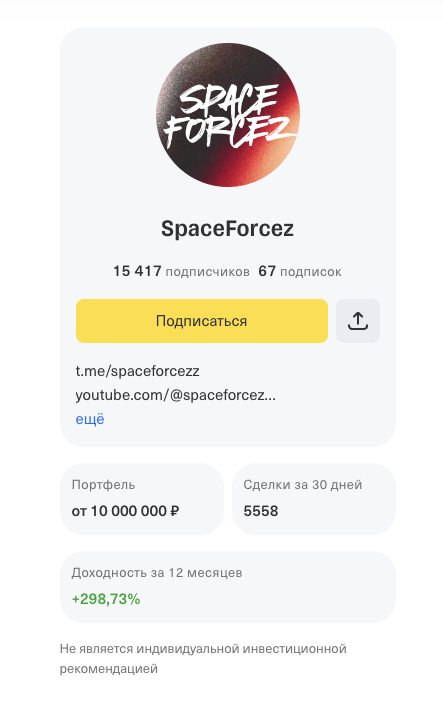 Space Forcez – проект инвестора, который оперирует капиталом, превышающим 10 миллионов рублей. Согласно информации из «Тинькофф Пульс», результативность торговли данного трейдера очень высокая – плюс почти 300% к депозиту за 12 месяцев.