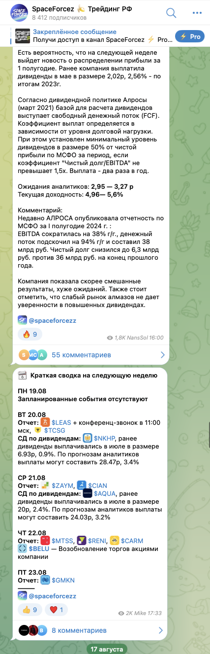 Pro – это «закрытый клуб», в котором админ делится глубокой аналитикой, стратегиями и торговыми идеями. Стоимость месячной подписки – 4 тысячи рублей. Однако если покупать доступ на несколько месяцев, то дается скидка в размере 5-15%.