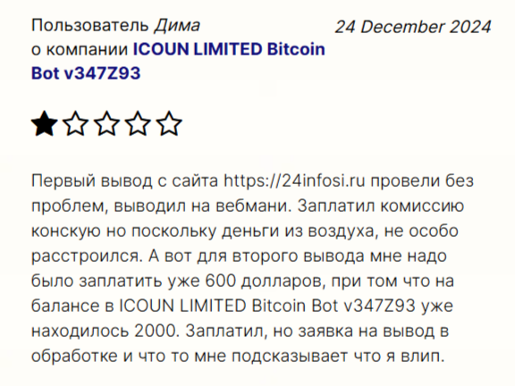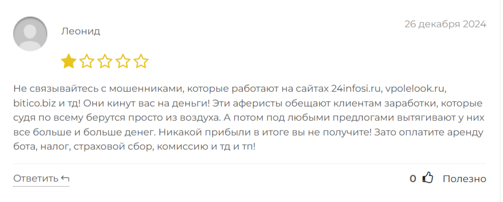 В некоторых отзывах о 24 infosi пользователи вовсе отмечают, что за компанией стоят аферисты. Их задача состоит в том, чтобы получить больше денег. Доход они не выводят, а требуют деньги за аренду оборудования, оплату страховки, комиссионные платежи и т. д.