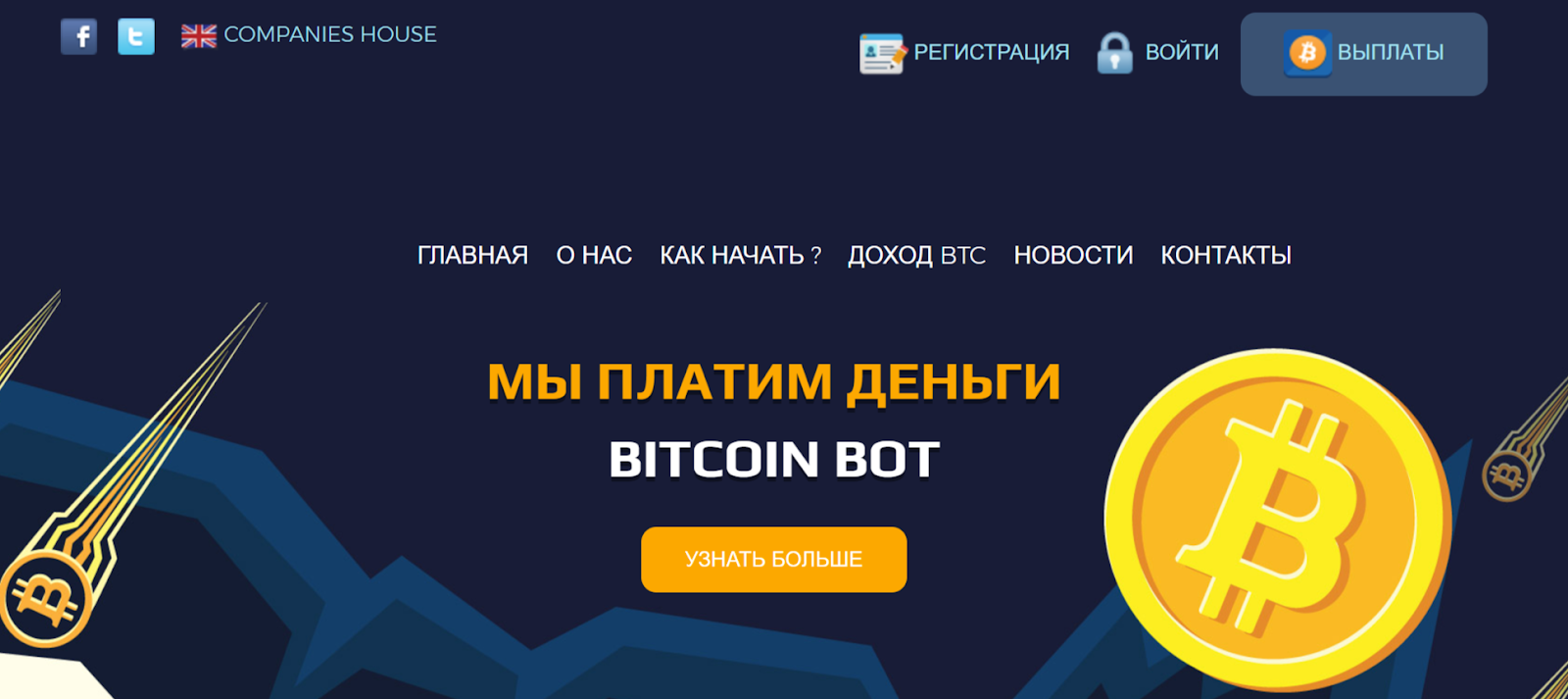 Сайт 24infosi представлен в виде одностраничника, что явно не добавляет доверия. В верхней части нашлось место для раздела регистрации, входа и получения выплат. Есть ссылки на управляющую компанию Companies House и соцсети криптовалюты Биткоин.
