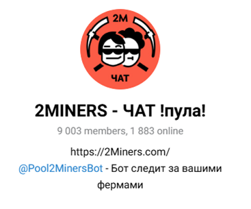 Единственной социальной сетью, где ведется деятельность «2майнерс ру» является Телеграм. Здесь у проекта несколько аккаунтов: новостной, чат для общения и бот, который необходим для отслеживания неполадок и сбоев в пулах.