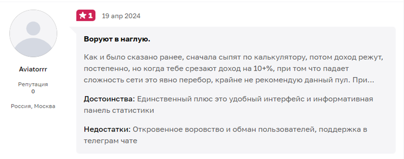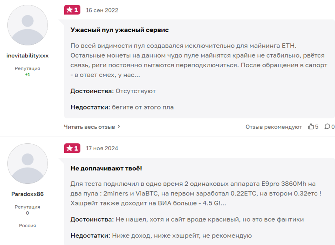 Пользователи отмечают, что майнинг на «2 майнерс пул» возможен и даже можно получить свои деньги. Но при этом разработчики воруют у клиентов прибыль, нередко возникают сложности с выводом, появляются скрытые комиссии. Многие отмечают хамское отношение суппорта.