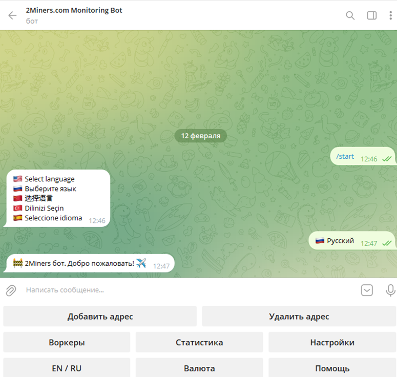 Для того, чтобы начать проверку и подключить бота к своему аккаунту, необходимо выбрать язык, добавить адрес кошелька и выбрать валюту. Но насколько 2Miners com Monitoring Bot эффективен, неизвестно. От пользователей отзывов по этому поводу нет.