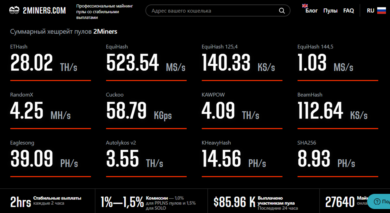На сайте 2miners ru первое, что нас встречает при попадании на сайт, – статистика доходности в пулах. Если ей верить, то на платформе более 27 000 майнеров и только за последние сутки было выплачено почти 86 000 долларов.