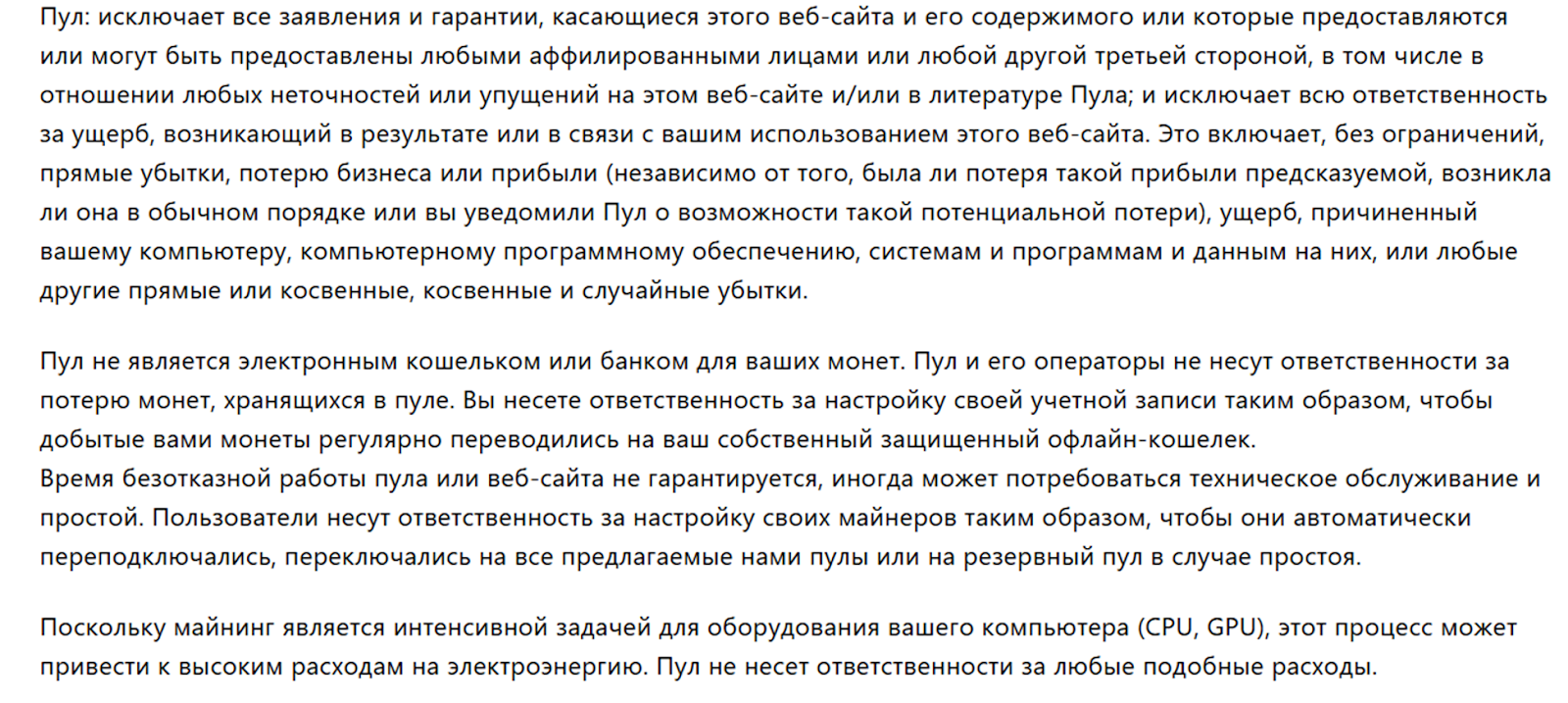 Политика пользовательского соглашения также составлена не в пользу клиентов платформы. Создатели майнинга снимают с себя всяческую ответственность за убытки клиентов.