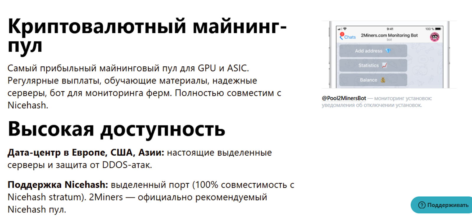 В случае проблем с подключением пула или доступа к аккаунту, следует связаться с менеджерами. Но их контакты представлены только электронной почтой и чатом в Телеграм.