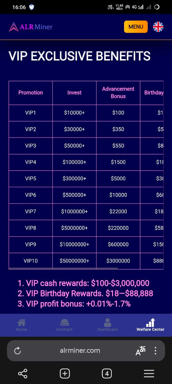 Компания предлагает майнерам бонусы за инвестиции и 10 VIP уровней. Условно это делится на три категории: