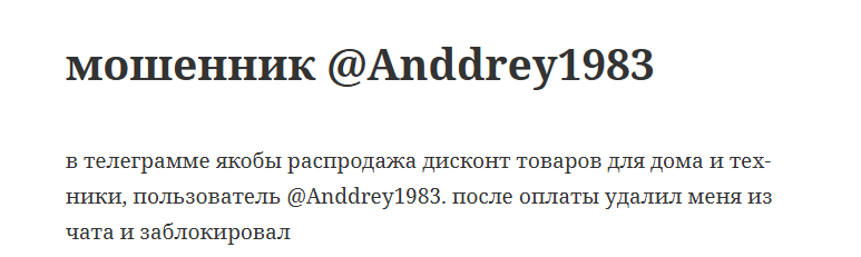Anddrey1983 – это профиль инвестора, который предлагает купить разные бытовые вещи и технику по сниженным ценам. Пользователь работает через личный аккаунт и не ведет публичных каналов. О его деятельности стало известно из отзывов. Используя реальный пользовательский опыт, проанализируем возможности заработка на услугах инвестора с никнеймом Андрей1983