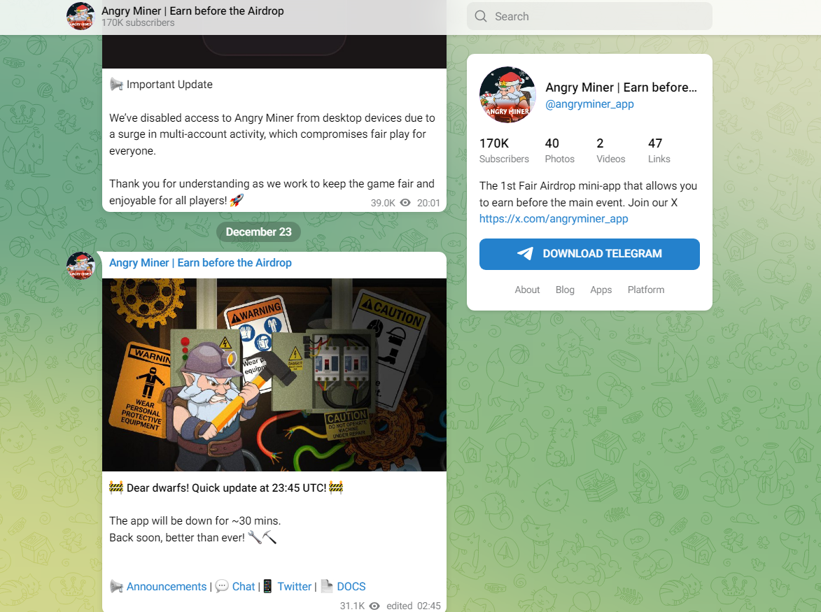 Ознакомиться с обновлениями проекта можно с помощью Telegram канала Angry Miner Earn before the Airdrop. На него подписано более 170 тысяч пользователей.